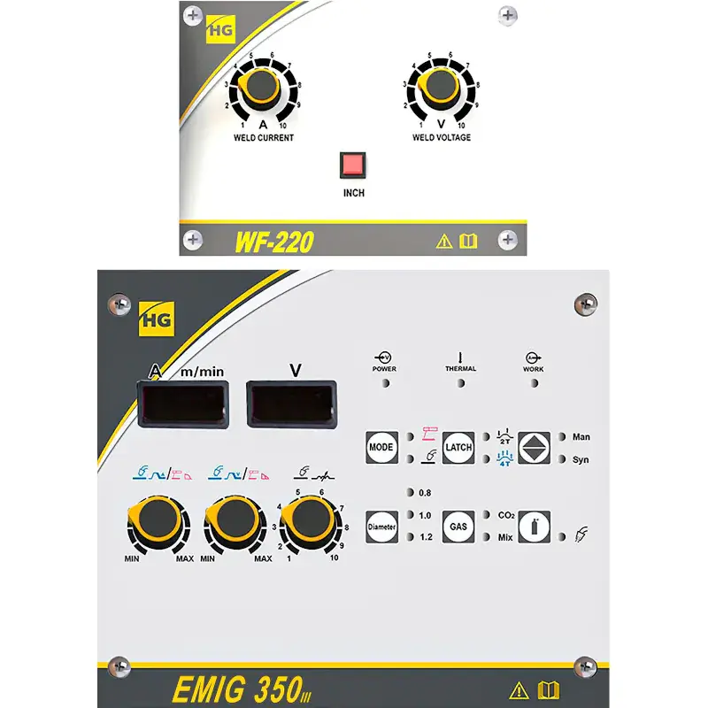 Вы можете вручную настраивать напряжение, силу тока, скорость подачи проволоки от 1 до 20 м/мин. Горелка сварочного аппарата Hugong EMIG 350 III работает в двух режимах: 2Т для формирования коротких швов и 4Т — длинных. В режиме синергетического управления все основные настройки задаются автоматически, что экономит время на подготовку к работе.