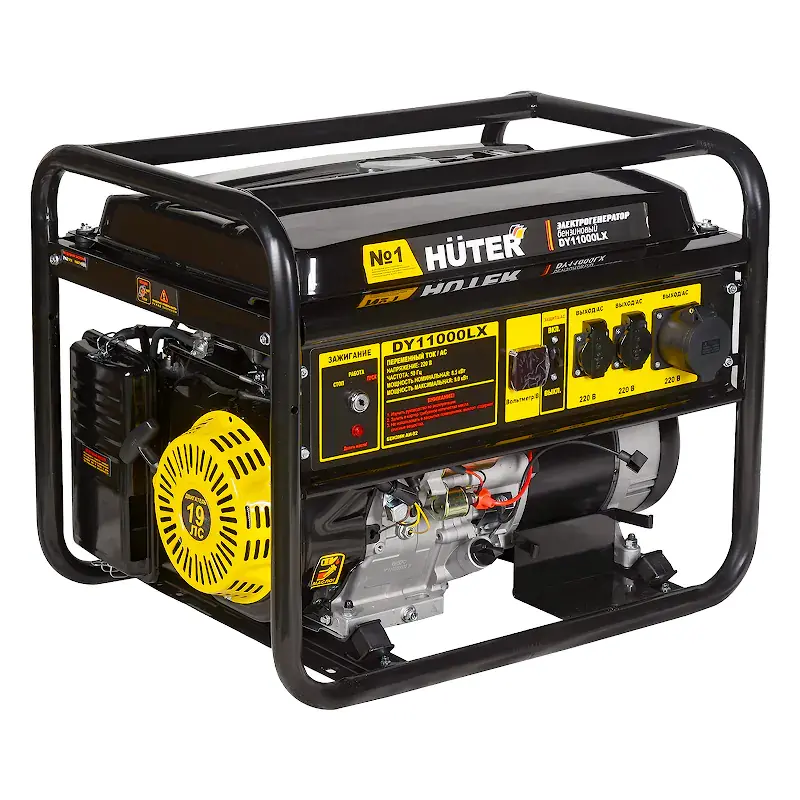 Бензиновый генератор HUTER DY11000LX служит в качестве автономного источника электроэнергии переменного однофазного тока напряжением 220 В при проведении ремонтно-строительных работ или в аварийных ситуациях. Номинальная мощность 9 кВт обеспечивает питание осветительных приборов, бытовой техники или электроинструментов, в совокупности потребляющих 8,5 кВт. Устройство работает от четырехтактного бензинового двигателя мощностью 19 л.с. Данная модель оснащена электростартером.