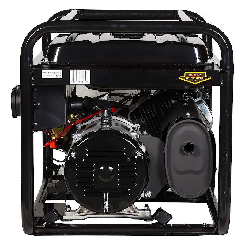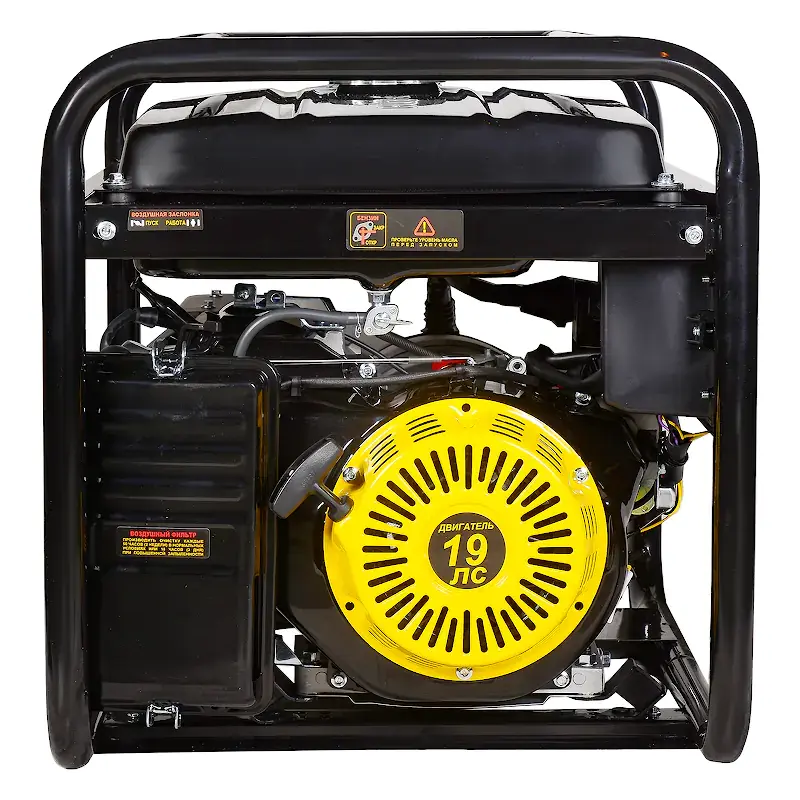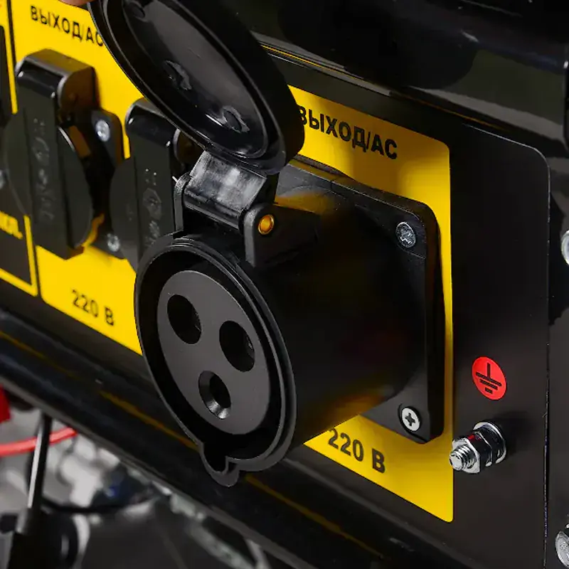 Потребителей электроэнергии можно подключать к двум розеткам переменного тока 220 В на 16 А или силовой розетке 220 В на 32 А. Индикаторы на лицевой панели бензинового генератора сигнализируют о низком уровне моторного масла и топлива. В комплект поставки входят: силовая вилка на 32 А, ключ электростартера, провода и детали лотка аккумуляторной батареи, а также комплект резиновых опор для устойчивости конструкции и снижения вибрации.