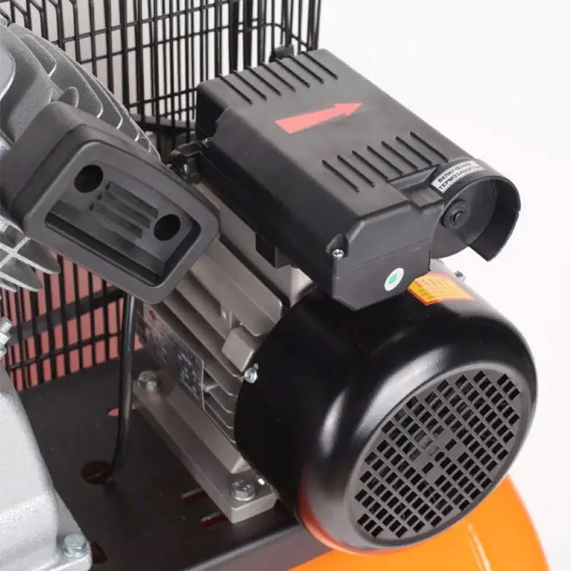 Масляный компрессор оснащен V-образной двухцилиндровой поршневой группой, которая приводится в действие электродвигателем мощностью 2,2 кВт через ременную передачу. Ремень оказывает демпфирующее действие, делает более плавным старт и мягкой работу, обеспечивает высокий КПД и выходное давление. Передаточное колесо выполнено в виде крыльчатки для дополнительного охлаждения поршневой группы. На поверхности головок цилиндров и воздухопровода предусмотрены ребра для улучшения теплоотдачи.