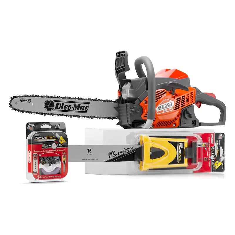 Бензопила Oleo-Mac GSH 40 (с шиной и цепью 16” системы PowerSharp) - компактная и легкая модель для домашнего использования, с расширенным комплектом пильной фурнитуры: с пилой вы получаете не только стандартную шину и цепь, но и дополнительный набор системы быстрой заточки PowerSharp: специальные шину, цепь и заточное приспособление!