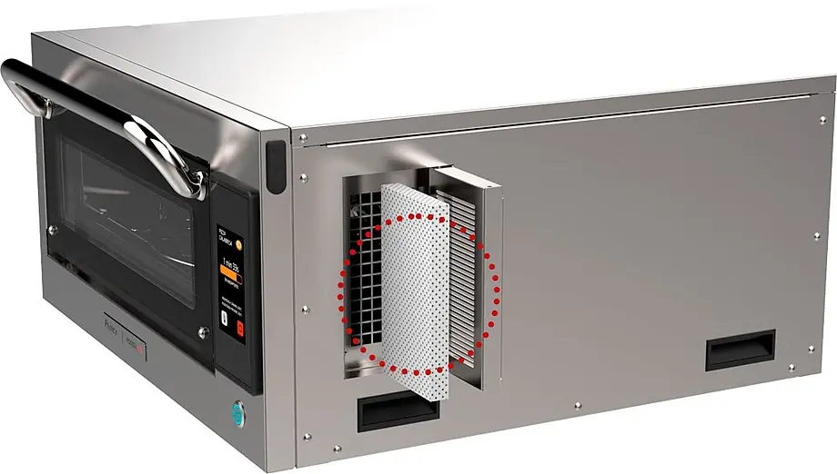 • Печь оснащена внутренним катализатором. Он удаляет пары жира на выходе из печи, превращая их в воду. Это технология VENTLESS, благодаря которой оборудование может работать без использования вытяжки типа I или II.