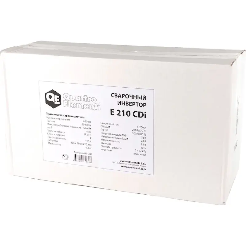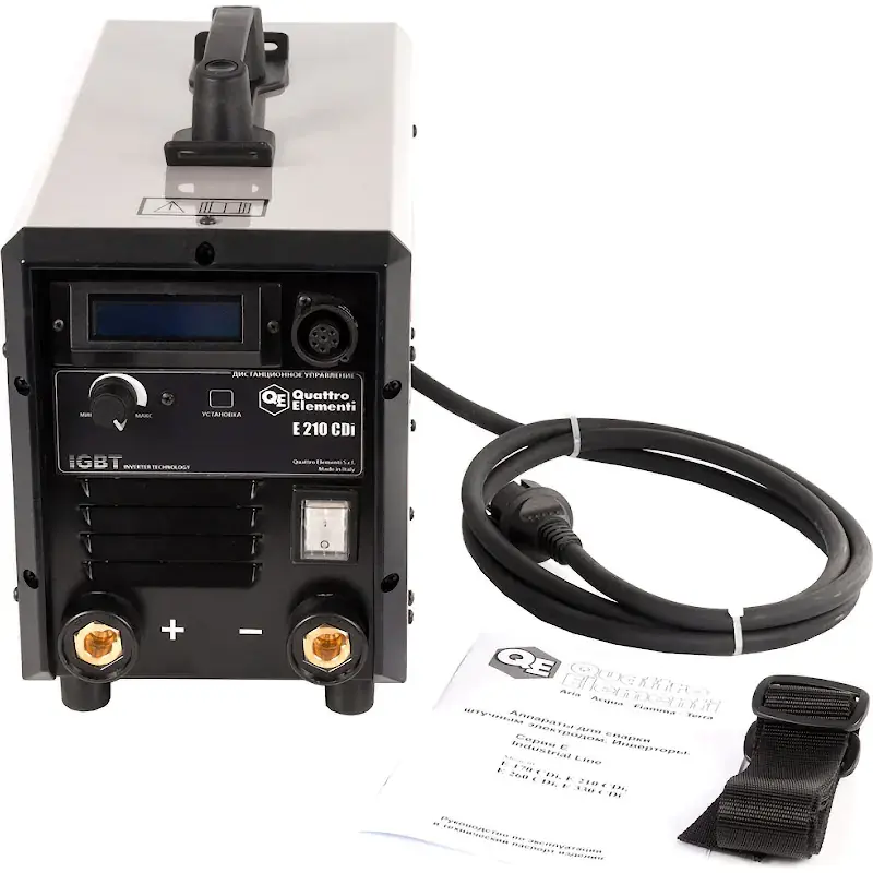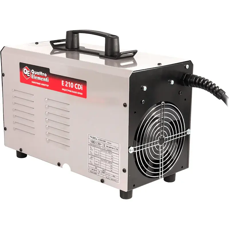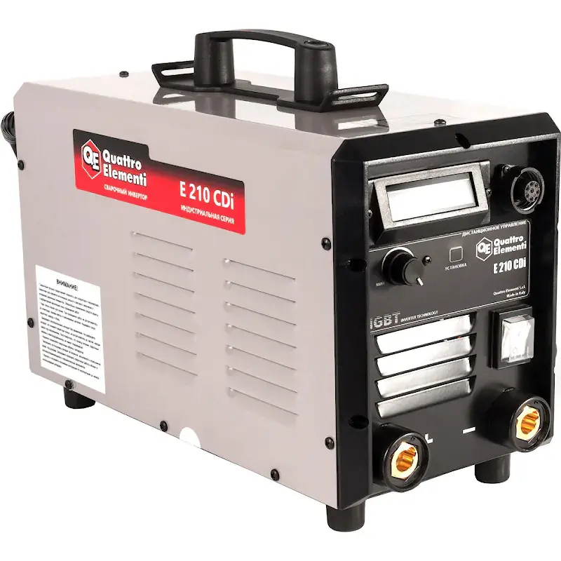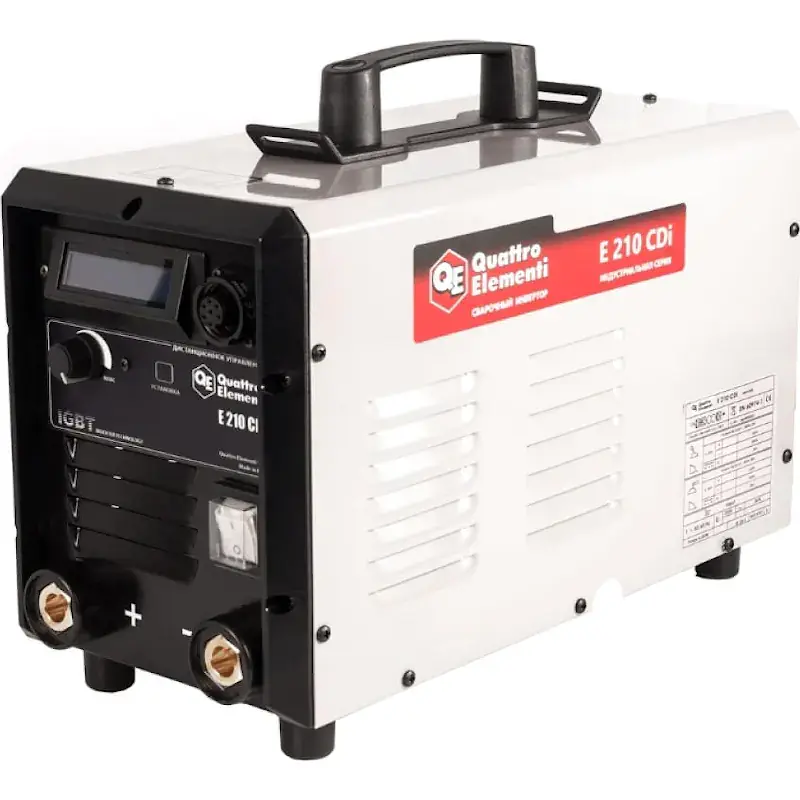 Инверторный аппарат электродной сварки QUATTRO ELEMENTI E 210 - это надежный агрегат MMA и TIG сварки, испытанный в условиях крайнего севера. Устройство осуществляет сваривание посредством различных типов электродов, в том числе алюминиевых. Работает от однофазной сети напряжением 220 В и частотой 50 Гц. Есть возможность подключить пульт дистанционного управления, благодаря которому оператор может регулировать величину сварочного тока прямо со своего рабочего места. Инвертор оснащен пульсером частотой 3/175 Гц. Максимальная мощность аппарата - 6.6 кВт.