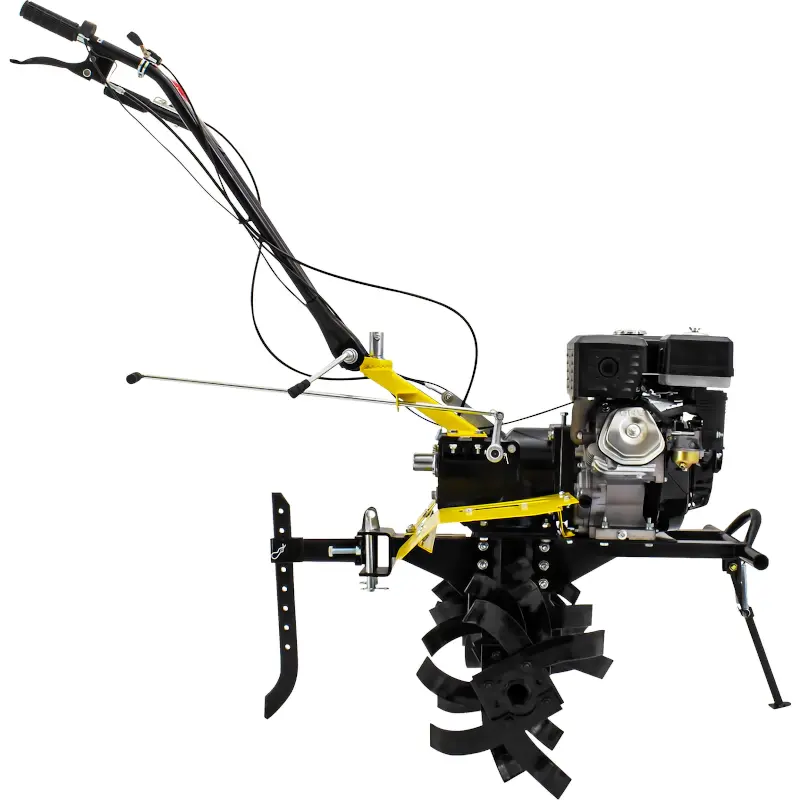 Руль регулируется по высоте, что позволяет оптимально подстроить его под ваш рост. Есть и настройка держателя по боковому вылету. Это пригодится для того, чтобы не наступать на только что обработанную землю, или работать вдоль ограждений.