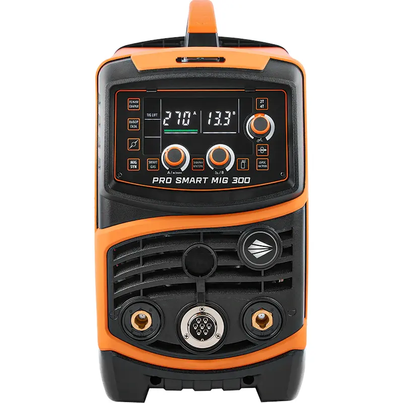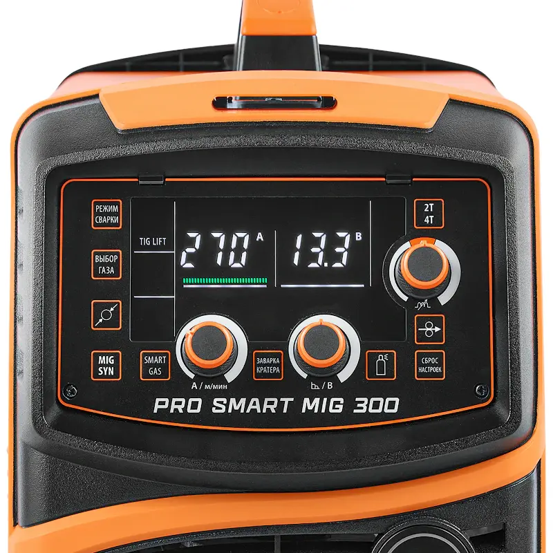 Сварочный инвертор Сварог PRO SMART MIG 300 максимальной мощностью 8,46 кВт — профессиональное оборудование для сварки алюминия, меди, титана, нержавеющих, высоко- и низкоуглеродистых сталей и сплавов. Аппарат рассчитан на эксплуатацию в суровых условиях при температуре окружающего воздуха -30_С. В отдельный механизм подачи сварочной проволоки можно заправлять катушки весом до 20 кг. С помощью аппарата, работающего в диапазоне сварочного тока 50–270 А, можно выполнять следующие виды сварки: покрытыми электродами 1,5–5,0 мм, аргонодуговую TIG Lift, проволокой в среде защитных газов MIG/MAG с автоматической подачей. Устройство работает от трехфазной сети с питающим напряжением 380 В.